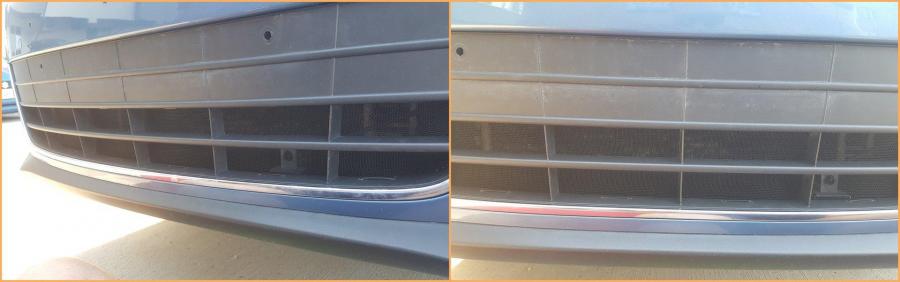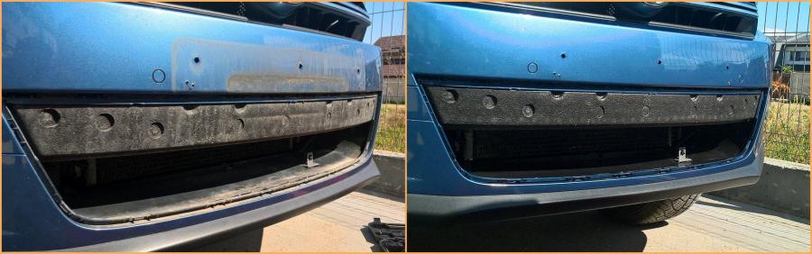 Am mai bifat inca ceva pe lista de modificari si anume am pus plasa metalica la grila inferioara din fata . Spre rusinea mea am pus plasa la mai bine de un an de la achizitia masinii cu toate ca era cumparata de peste 6 luni..... Cu ocazia asta am vazut si cat de mult jeg ramane prins intre suportul de numar si bara. Cert e ca piticul de pe creier s-a activat si acum trebuie sa bifam o astfel de curatare cel putin odata pe an : Ocazie in care am vazut si cat de ciuruita este bara, in suportul de plastic erau date si doua suruburi de neam prost cu toate ca toate clipsurile erau intregi si intacte. Scoaterea grilei nu a fost asa de usoara cum am crezut.....mare grija cand se trage , mai greu cu scosul primului clips , pentru restul e cancan.... Am folosit plasa de aluminiu (tip plasa de gradina) , identica cu cea folosita pe GOLF . Granuliatia este destul de fina sa opreasca pietrele si insectele dar destul de larga sa permita aerului sa treaca corespunzator. Plasa am vopsito negru lucios inainte de montare : Grila a fost gaurita "fin" de jur imprejur pentru a prinde plasa cu soricei negrii. Iar rezultatul final arata cam asa : Iar la final am montat si un suport de numar "intim" sa renunt la suportul dublu: La plasa sunt complet multumit , a iesit foarte bine dupa parerea mea , de la suportul de numar ma asteptam sa fie mai WOW , nu e chiar ce ma asteptam dar intr-un final a iesit :2 points