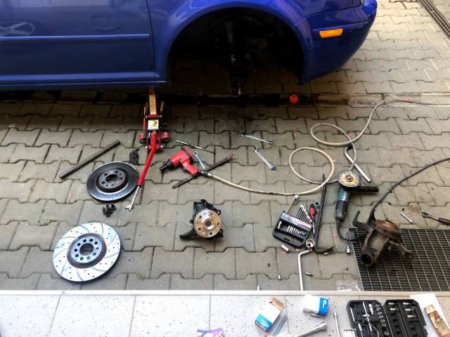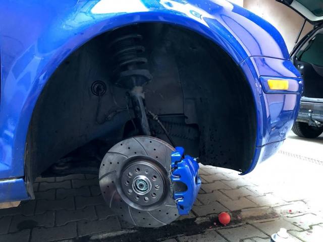Si inca nu am ajuns sa inlocuiesc numarul de pe fata. Asta doar pentru ca am avut o gramada de treaba Unu la mana...ne-am luat casa pe roti, si pe langa serviciu si santier, am mai avut de lucrat si la asta. Pentru ca vrem altfel de concedii, mai libere de "booking" si alte minuni de genul. Si pentru ca ...rulota are MTMA 1400 KG, aveam nevoie de franele mai mari. Cele vechi de 280mm si asa erau subdimensionate... si erau deja uzate. In plus, un rulment pe fata a inceput sa urle de nebun ca s-o saturat de munca pe care o facut-o. Frati-su de pe partea ailalta nu zicea nimic.... Asadar, rulmenti noi SKF (Nu mai pun in veci rulmenti Optimal), butuci noi, senzori ABS/ESP noi (nu cred ca-i scoteam intregi pe ceilalti)... Si ne-am apucat de treaba. 5 minute la o presa cu un prieten si gata butucii si rulmentii. Apoi...montajul. Asa arata un disc de 280mm (jos) vs 312 (sus) Pe partea dreapta trebuia schimbat si un burduf de planetara, asadar, am dat jos capul de planetara si am zis sa il curat.. dar mi-a scapat in galeata cu solutie de spalat (motorina+benzina amestecata) si am facut lego... Pe partea cealalta in schimb, am rupt un cap de bara Lemforder. Pacat de el ca nu avea joc si se prezenta bine, dar nu o vrut deloc sa se desfaca surubul de pe fuzeta, mai degraba s-o rupt... Si...cam asa arata montate pe masina. Deocamdata se simt ok. okish... nu sunt 100% multumit...dar astept sa se aseze placutele bine pe discuri si dupaia mai vedem. Pare ca prind tot mai bine pe masura ce parcurg km. Va urma/To be continued... etc Drumuri bune1 point