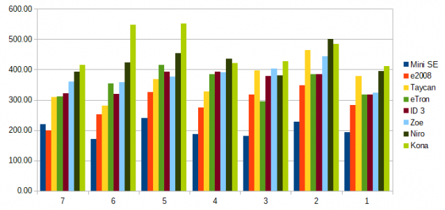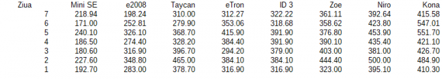 @voinea, am vrut sa am in lista doar masinile "affordable" cu autonomia cea mai mare, dar pot face si comparativ cu toate. Autonomia tuturor masinilor din test, de la cea mai mica la cea mai mare: Grafic: Si diferentele peste 171 km (care a fost cea mai mica autonomie estimata inregistrata la o masina in test - Mini SE in ziua a 6-a): Ordinea intre Taycan si eTron mi-a pus un pic de probleme, Taycan-ul nu a fost fortat in primele trei zile, din cauza asta bara de autonomie a Taycan-ului e mai mare decat a eTron-ului la inceput (si relativ la celelalte masini, de asemenea). Pe urma, s-au dus emotiile si se pare ca au calcat acceleratia testerii... Uite si un link catre un comparativ cu performantele dinamice ale modelelor din lista (cu exceptia e2008 care nu e in baza de date, si Taycan care e de pe alta planeta): Audi e-Tron 55 Quattro vs Hyundai Kona Electric 64 vs VW ID.3 1st vs Kia E-Niro vs Mini Cooper SE vs Renault Zoe R135 Am atasat si fisierul cu datele, daca doriti sa va jucati cu ele. AutoMarket ElectricRomania 2020 - Autonomii.ods1 point