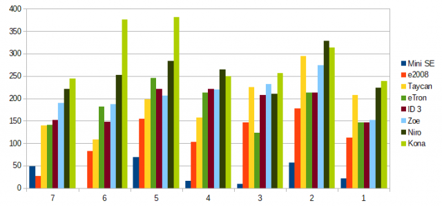 Am formatat autonomiile estimate in fiecare zi pentru ID3, Zoe, Niro si Kona in testul de la AutoMarket: Iata si grafic: Si un grafic cu cat peste 300km au fost acele autonomii: ID3 a avut autonomie medie mai mica decat Zoe! Asta a fost cea mai mare surpriza pentru mine, sa vad cat de putin consuma Zoe si ce autonomie mare are (oficial 400 km din bateria sa de 52 kWh). Nu am vazut atat tam-tam in jurul lui Zoe la noi in tara, dar e clar ca practic cu Zoe poti merge chiar un picut mai mult decat cu ID3. Niro si Kona au fost masinile cu autonomia cea mai mare, Kona a avut in permanenta cu 100 km mai mult autonomie decat ID3, in timp ce Niro cam 60-140 km. Exceptia sunt zilele 3 si 4, cand diferentele nu au fost mari intre masini. Autonomia mai mare trebuie privita si prin prisma ca viteza medie cu Niro si Kona a fost mai mare decat cea cu ID3. Fara suparare Bogdan, dar nu poti spune ca doar ID3 a fost condusa sportiv, celelalte nu, si cu toate astea nu stiu cum dar viteza medie cu ID3 a iesit mai mica decat cea cu celelalte masini... Kona are un cuplu motor mai mare decat ID3, are 400 Nm, care se simte cand accelerezi, rupe aderenta la rotile din fata mereu daca apesi pedala la fund cum esti obisnuit la termice. Cine vrea mers in confort fara asa ceva si cu suspensia setata pe confort are Niro, dar e la un pret la noi intentionat pentru ca masina sa nu se vanda in Romania, cum am spus in alt comentariu de pe un alt thread. Cum spera VW sa vanda Plus-ul, cand cer aceiasi bani pe el ca pe o Kona Luxury+, care are autonomie mai mare cu 100 km, reprize mai rapide (vezi clasificarea de pe zeperfs) si vine cu mai multe pe ea? ID3 are intr-adevar mai mult spatiu in spate, si portbagajul un pic mai mare 385l fata de 332l, dar tot putin e.2 points
