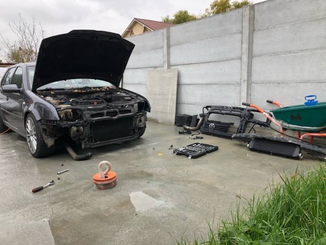 Astazi a fost din nou o zi productiva. Am lucrat la spatele masinii, unde am demontat bara, spoilerul si senzorii. Am curatat bine spoilerul, am slefuit foarte putin (pentru a nu modifica textura) si am aplicat spray negru mat intr-un strat foarte subtire. La fel si pentru prelungirea si grilele de la bara fata. Sunt multumit de rezultat. Apoi am montat prelungirea, senzorii si lampile de numar pe noua bara, pentru a o monta completa. Culoarea iesita nu este identica cu cea de pe masina, dar nici nu ma asteptam. Am fost avertizat in legatura cu asta. Este totusi foarte apropiata si sper ca nu se va vedea chiar de la o posta. La botul masinii au sosit toate suruburile comandate, voi mai merge doar sa iau unele din dezmembrari pentru bara fata. Astazi am lucrat putin la alinierea farurilor, dar nu am terminat inca (stiu ca nu stau inca bine).2 points