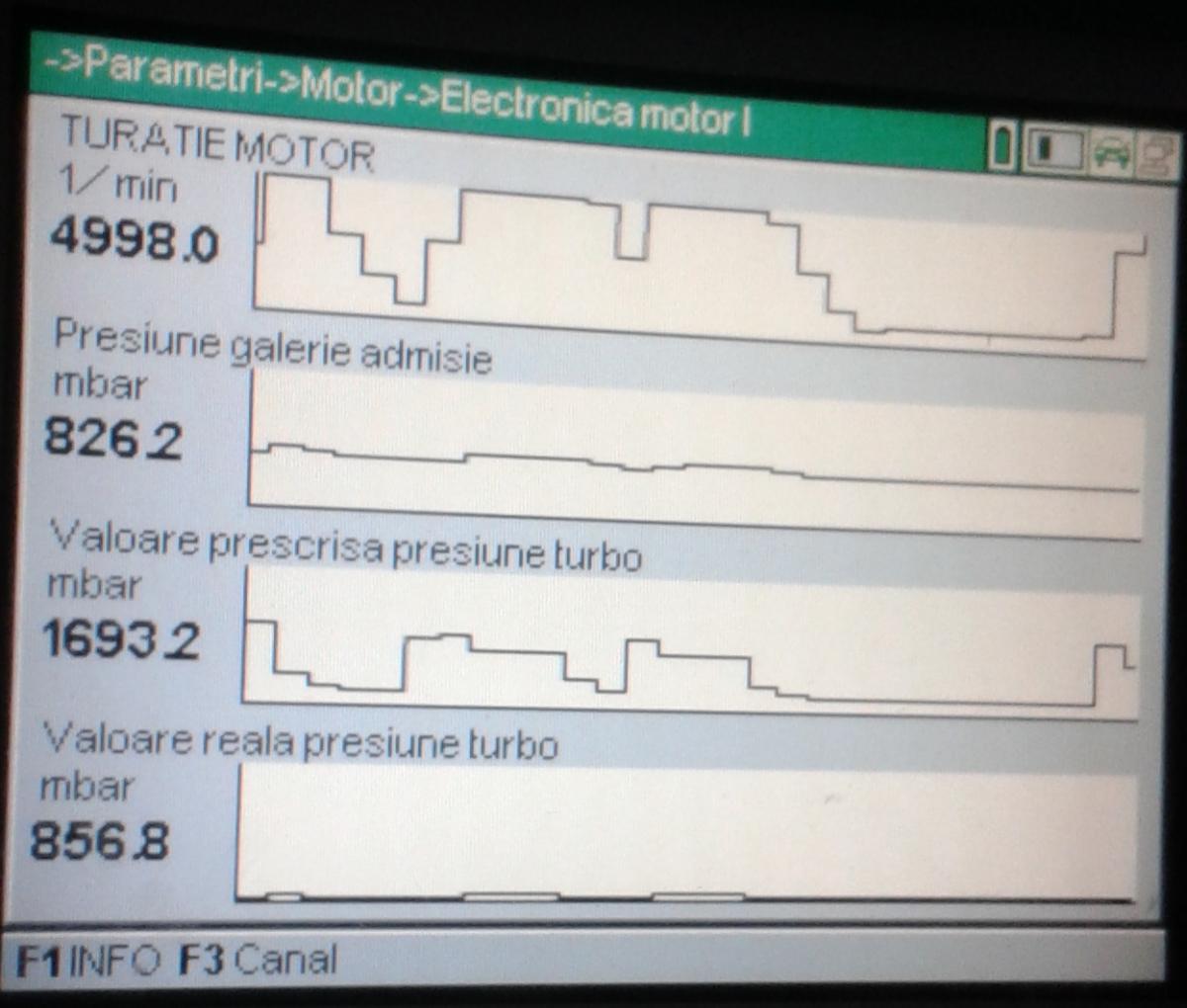 Salut, va multumesc pentru sfat. S-au adunat mai multi mecanici si au gasit un senzor turbo charger defect  (cred ca este pe langa intercooler langa  farul din dreapta al masinii), l-au schimbat si acum am vacum mult mai bun si pe EGR, pe supapa N75 (lucreaza  la accelerare) si la cele 3 electrovalve de langa EGR (am crezut ca sunt duse si alea dar au vacum). Dupa ce am schimbat senzorul acela au disparut si erorile acelea 4 pe care le-am pus la postul trecut. Dar tot in limp mode este masina si tot nu trage. Nici alte erori nu au mai aparut deocamdata dar ma astept sa reapara. Am mai incercat sa fac un log in mers dar nu cu vag-ul pt ca nu era prezent cel care avea programul si va atasez pozele cu presiunea pe turbo. Mecanicii spun ca nu cred a e dus turbo pt ca ar trebui sa iasa gaze de esapament mai negre iar turbo se aude ca descarca. Presiunea pe furtunul care intra in partea de la clapeta de accelerare langa EGR este destul de mica atunci cand accelerez. Mecanicii au luat la control toate furtunele si firele la partea electrica si totul pare ok. Totusi mi s-a parut dubios la valva N75 se parea ca a fost umblat si ca surubul inferior al tijei actuatorului nu mai este chiar la semn - se poate sa fie si asta dereglat (cum se regleaza corect?)