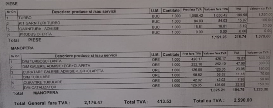 Masina merge perfect in oras, dar in afara orasului pe la 2500-3000 cu a 4-a (depasire sau deal) se simte diferenta in pedala de acceleratie iar turbina se decupleaza. Trebuie repornit motorul pentru a-si reveni. A fost curatata turbina iar 2-3 ani a mers perfect. Recent au inceput iar simptomele si am mers la un service auto specializat pe turbo sa-mi faca o diagnoza completa (tester + verificare mecanica). Dupa diagnoza si 150 de lei - problema: presiune prea mare in turbina + calamina, am primit oferta de pret ~ 2600 de lei care arata cam asa: