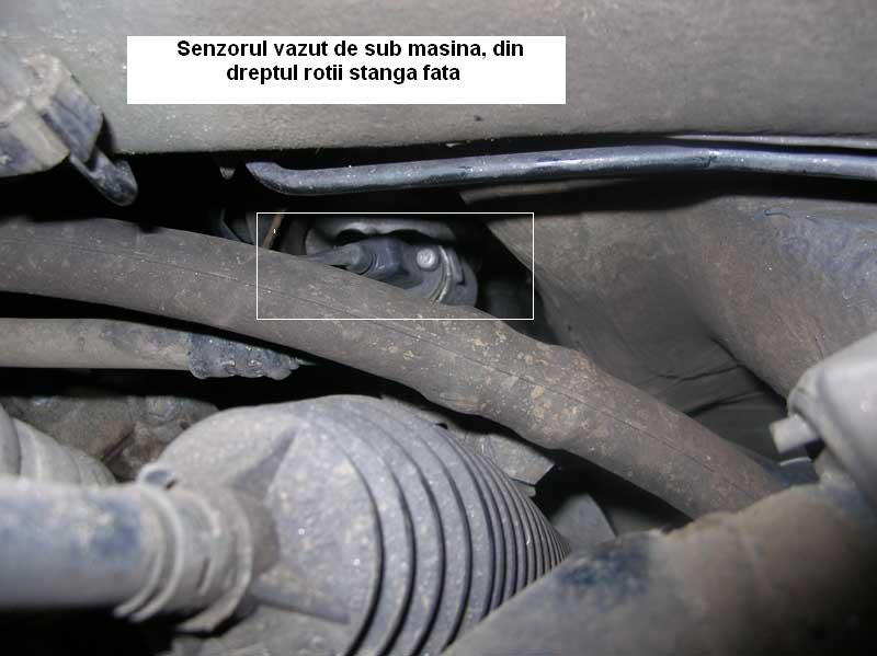 Este destul de usor sa-l dai jos daca ai o surubelnita cu clicket si un racord-prelungitor flexibil. Dai roata stanga fata jos si pe sub masina cu un imbus de 4 cred, desurubezi cele doua suruburi (de sus si jos). Apoi pe deasupra bagi o surubelnita dreapta intre caseta si senzor departandu-l si tragandu-l inspre exterior. Se scoate apoi firul din suportii de plastic si mufa din pompa. E mai usor daca dai jos si aparatoarea de noroi de la roata. Anexez cateva poze