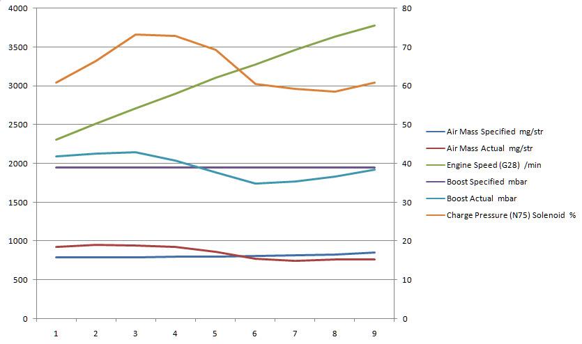 Până la 3000 rpm lucrurile sunt relativ ok,  chiar ai ceva suprapresiune. Deci dacă  nu trage până la această turaţie atunci nu turbina este de vină, dacă nu trage după 3000 rpm atunci se poate găsi aici un motiv.  Conform manualului valorile presiunii, duty cycle şi MAF la 3000 rpm sunt ok.